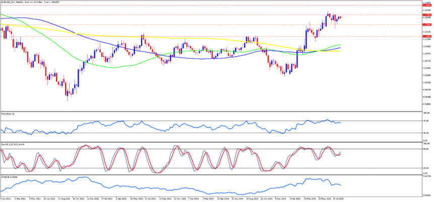 Die Indikatoren deuten darauf hin, dass das Momentum weiterhin günstig für die Bullen ist. Der RSI von 63 deutet auf eine zinsbullische Tendenz hin, ist aber noch nicht überkauft, so dass noch Spielraum für weitere Aufwärtsbewegungen besteht. Der Stochastik-Oszillator bewegt sich in der Nähe des oberen Bereichs um 70-80, was einen starken Kaufdruck widerspiegelt, aber auch das Potenzial für kurzfristige Pausen erkennen lässt. Die gleitenden Durchschnitte sind jetzt zinsbullisch ausgerichtet, wobei der Preis bequem über den 50-, 100- und 200-Wochen-MAs handelt. Der Bereich um 1,15 dient als solide Unterstützung, während die zu beobachtenden Widerstandsniveaus bei 1,1870 und der psychologischen 1,20-Marke liegen.