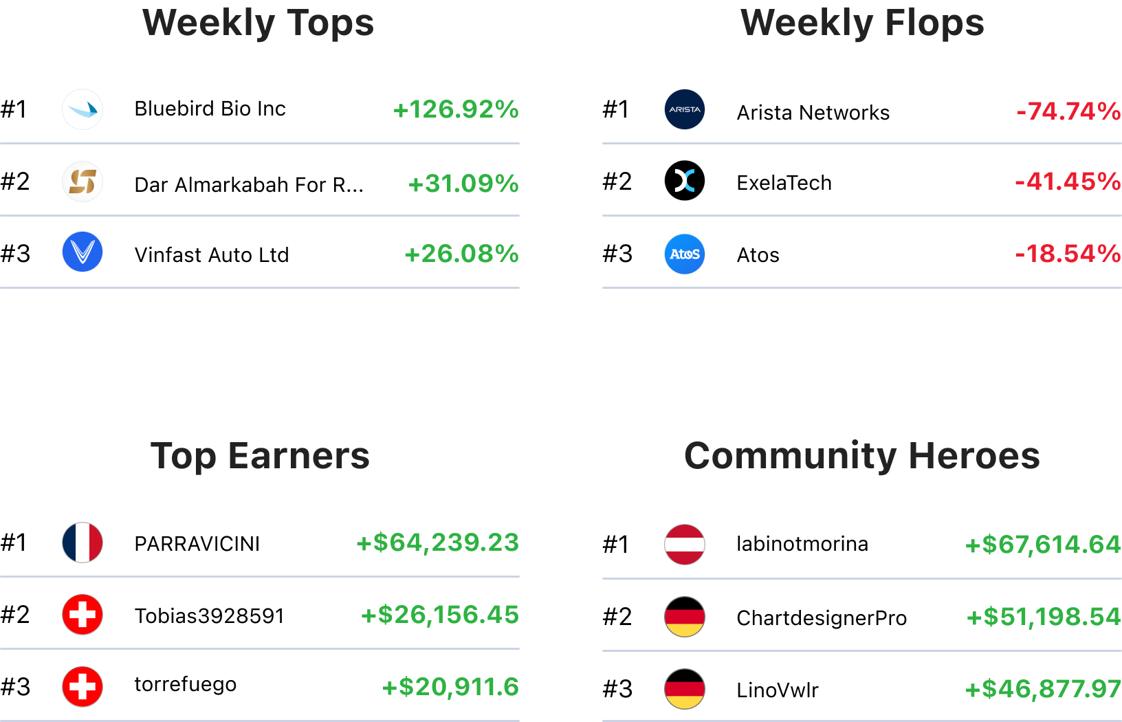 Parravicini, an active trader, opened 32 trades this week, investing a total of $151,160.95. His focus was on IOTA/USD, leading with 16 trades, followed by ALGO/USD (4 trades), XRP/USD (3 trades), and a diversified selection across 9 other assets. IOTA/USD stood out as his primary focus, indicating a calculated strategy to capitalize on crypto trends. Parravicini’s diversified portfolio demonstrates a balanced approach to trading, leveraging both high-volume assets and niche opportunities for steady growth. | Bluebird Bio Inc (BLUE), a biotechnology company specializing in gene therapies, saw its stock skyrocket by 126.92% this week. The surge was fueled by positive clinical trial results for its experimental sickle cell treatment and growing optimism around an upcoming FDA decision. Investors are also encouraged by Bluebird's strategic focus on advancing its pipeline and addressing unmet medical needs in genetic diseases. The company’s momentum was further boosted by a favorable regulatory environment, reinforcing confidence in its long-term growth prospects. |