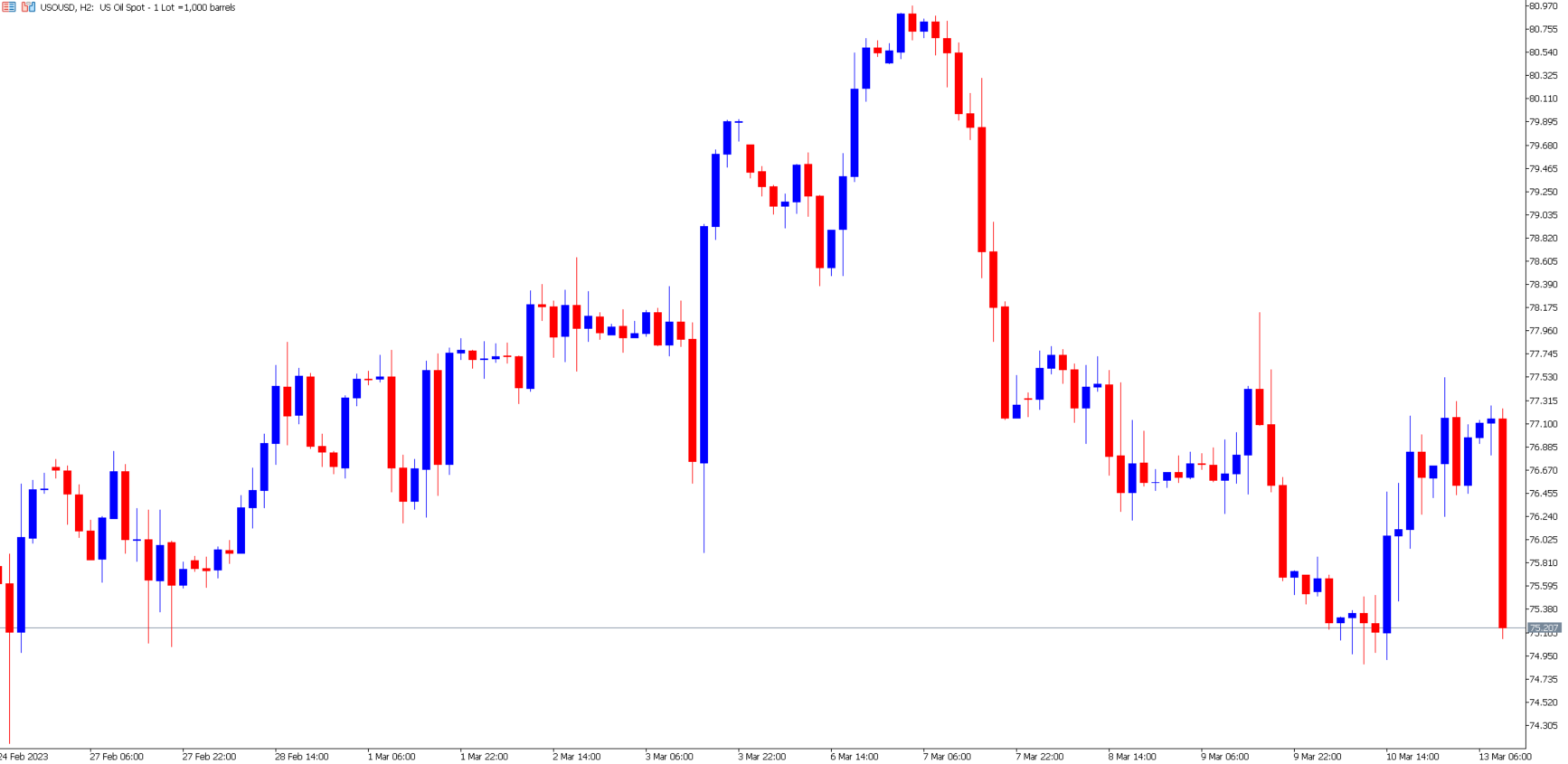 El petróleo también está experimentando mayores niveles de volatilidad y ha bajado un 1,20 % en las últimas 2 horas. La principal preocupación de los exportadores de petróleo y de las empresas es si la economía corre ahora un mayor riesgo de recesión. Sin embargo, la mayoría de los analistas siguen creyendo que es probable que el precio del activo se mantenga dentro de la horquilla de los 10 $, a menos que la crisis del SVB se convierta en una crisis bancaria.